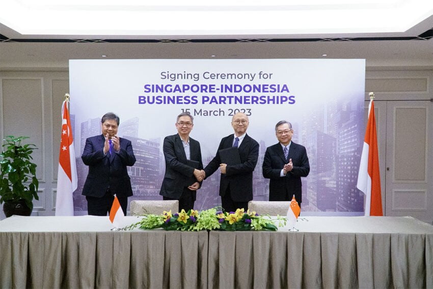 Caption Foto Headline: Indonesia Coordinating Minister of Economic Affairs (Airlangga Hartarto), CEO of PT Theta Solusi Indonesia (Herman Dinijanto), CEO and Co-Founder of 6Estates Pte Ltd (Dr. Luan Huanbo), Singapore Minister for Trade and Industry (Gan Kim Yong) – At the Signing Ceremony for Singapore-Indonesia Business Partnerships on 15 March 2023.